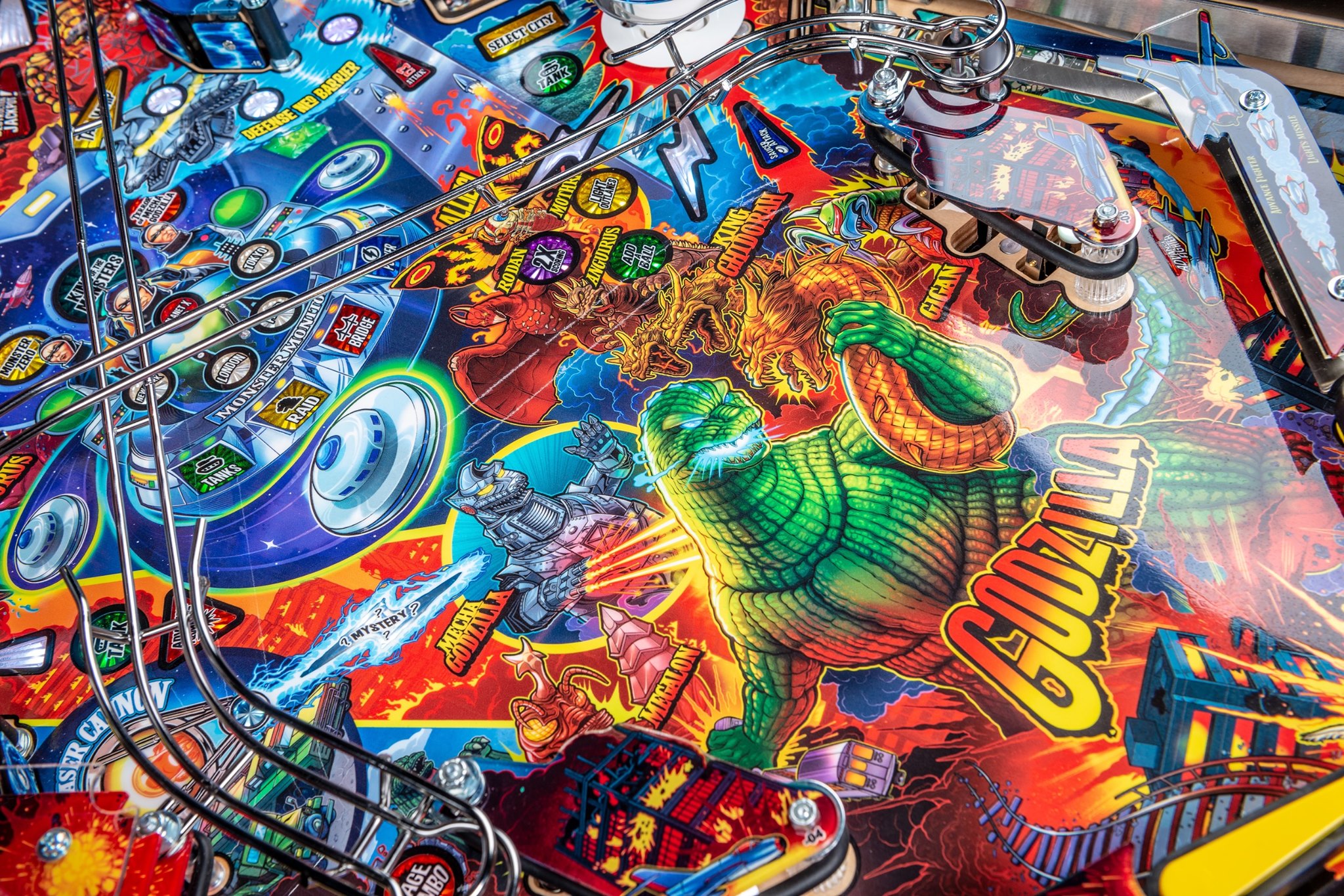 The Godzilla Pro Pinball Machine features breathtaking artwork that captures the epic scale and destructive power of Godzilla. The cabinet is adorned with dynamic, detailed illustrations of Godzilla and other iconic kaiju from the franchise, rendered in bold, vibrant colors. The playfield is equally impressive, featuring thematic elements and intricate designs that immerse players in the heart-pounding action of a Godzilla film.