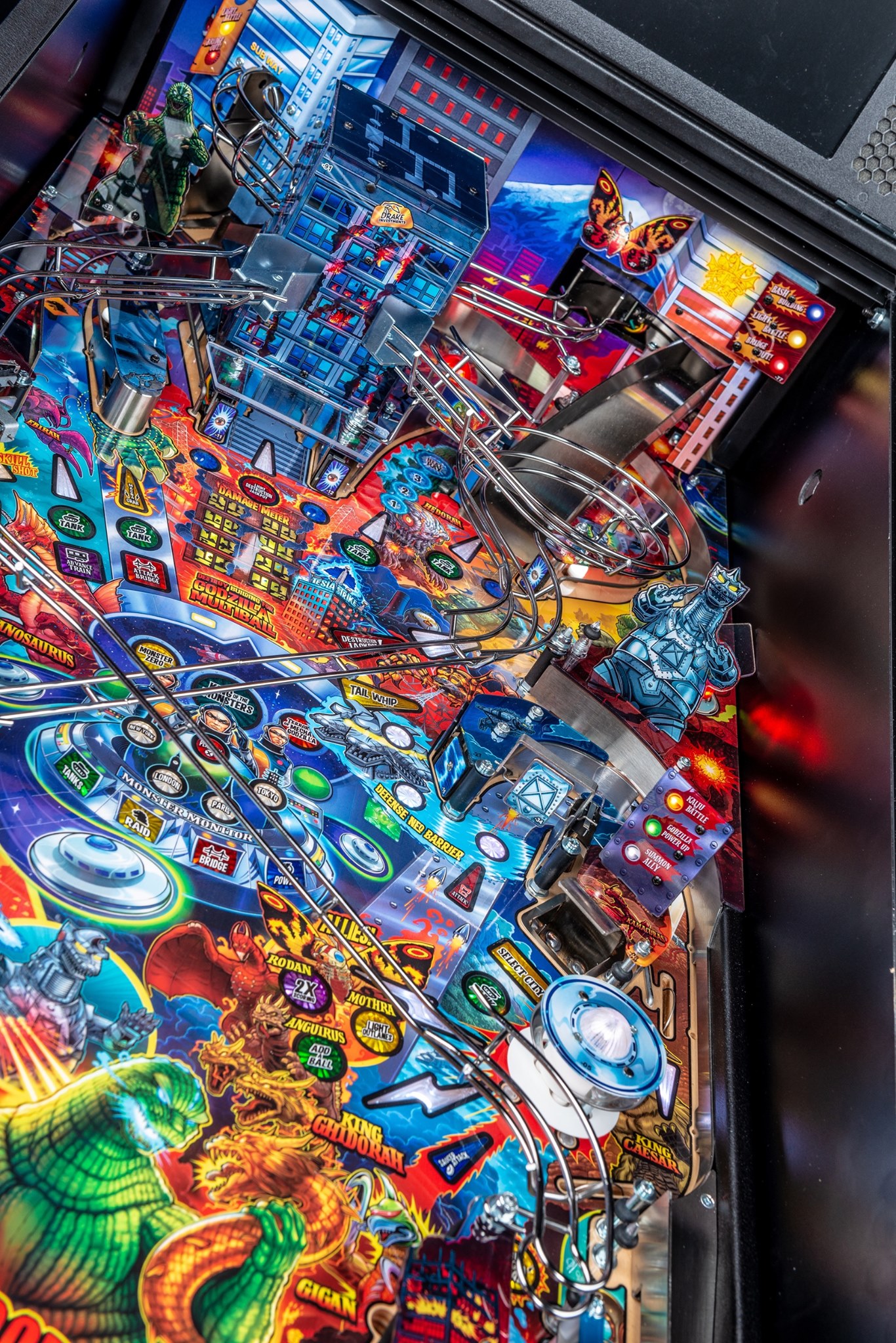 • Interactive Toys and Mechanisms: The Godzilla Pro Pinball Machine includes a variety of interactive toys and mechanisms that bring the epic battles to life. Key features include a custom-molded Godzilla figure, a destructible building bash toy, and a rotating mechagodzilla target, all adding depth and excitement to the gameplay.