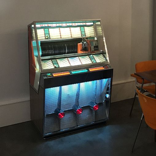 The Seeburg 201 showcases a distinctive 50’s edge with ruby lights and jet-age chrome accents. It holds 100 x 45-RPM records, providing 200 selections through its famous Select-O-Matic mechanism. Equipped with a high-fidelity amplifier and four internal speakers, it faithfully reproduces the rich, analog tones of classic vinyl. This striking model remains one of the most sought-after examples of retro-styled jukeboxes available in Australia.