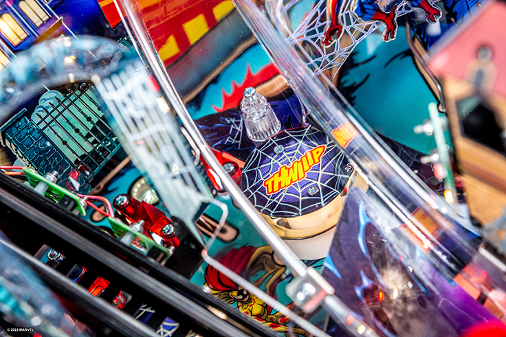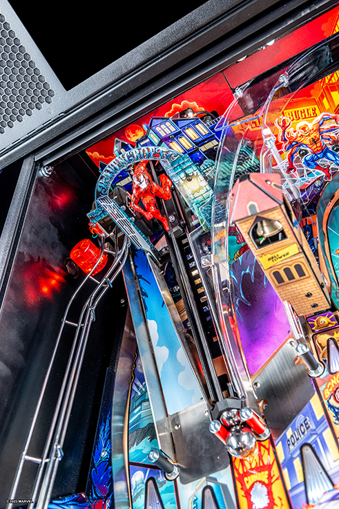 The Venom Pro Pinball Machine boasts eye-catching artwork that captures the essence of Venom’s dark and dynamic universe. The cabinet is adorned with vibrant, detailed illustrations of Venom, his symbiote allies, and formidable foes. The playfield is meticulously designed with thematic elements and intricate details that bring the Marvel universe to life, immersing players in Venom’s chaotic world.